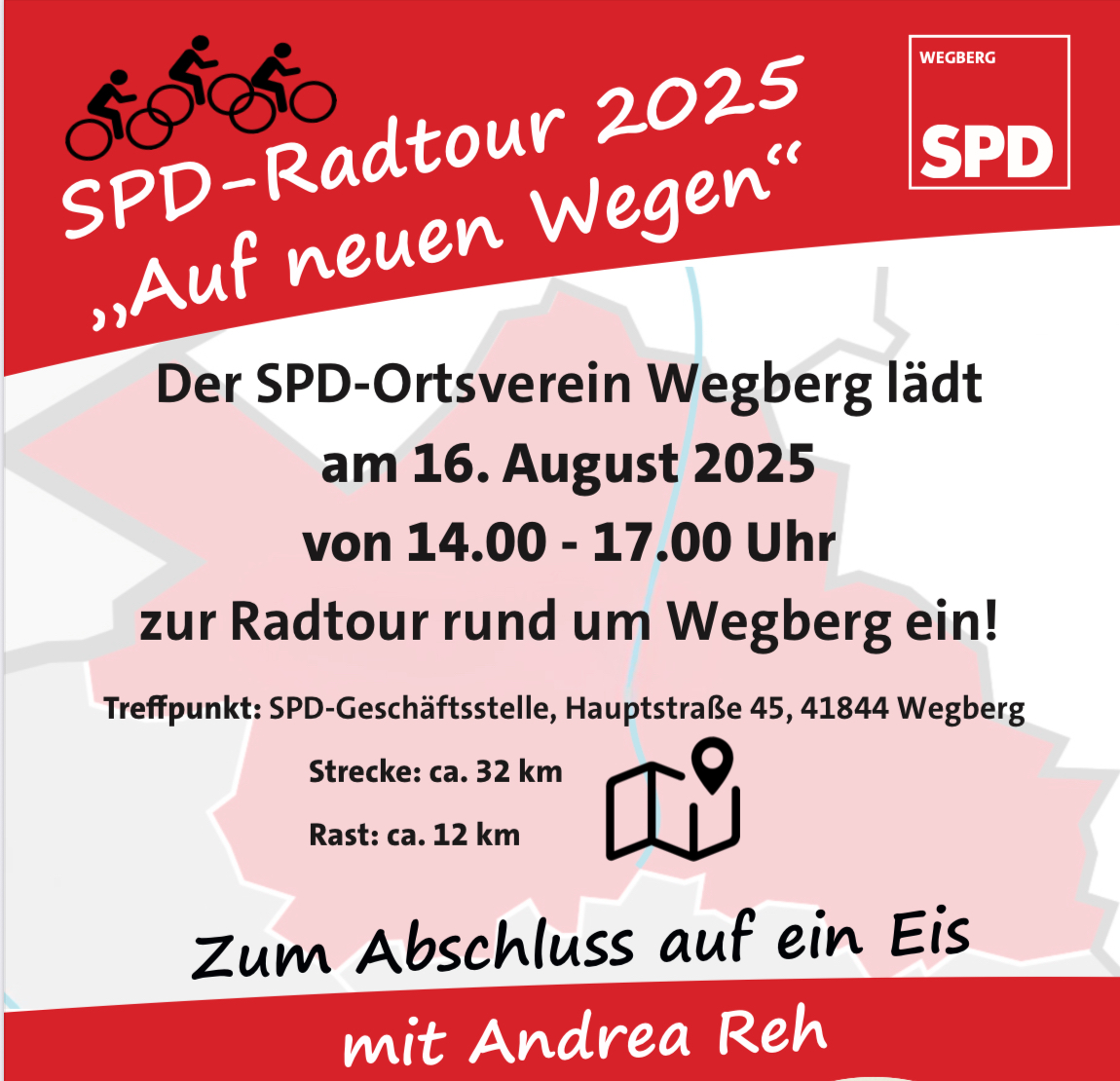 Die SPD Wegberg lädt alle am kommenden Samstag, den 16.08.2025, in der Zeit von 14.00 Uhr bis 17.00 Uhr, zur SPD-Radtour 2025 „Auf neunen Wegen“ ein. Auf der ca. 32 km langen Strecke können sich die Teilnehmerinnen und Teilnehmer von den neuen Rad- und Feldwegen rund um Wegberg überzeugen. Führt die Route doch Großteils über die in den letzten 2,5 Jahren erneuerten Wege. Die Strecke ist leicht, auch ohne eBike, zu schaffen.